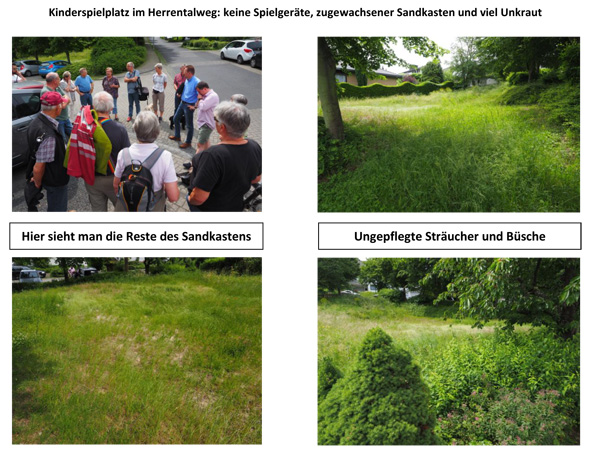 Wie die Anwohner im Herrentalweg und in der Vogelsangstraße den SPD-Mitglieder berichteten, gibt es erstens noch viele Kinder in ihren Wohngebieten, die unter 14 Jahre alt sind und gerne auf einem intakten Kinderspielplatz spielen würden. Zweitens, so erzählten sie, wurden ja peu à peu die Kinderspielplätze demontiert, Spielgeräte wurden nicht repariert oder erneuert, die vorhandenen Bänke wurden nach und nach abgebaut, die vorhandenen Sandkästen verrotteten. Da war zum Spielen nichts mehr da und die Eltern ließen natürlich ihre Kinder auch im "Unkraut" nicht mehr spielen.